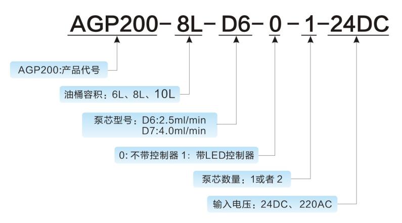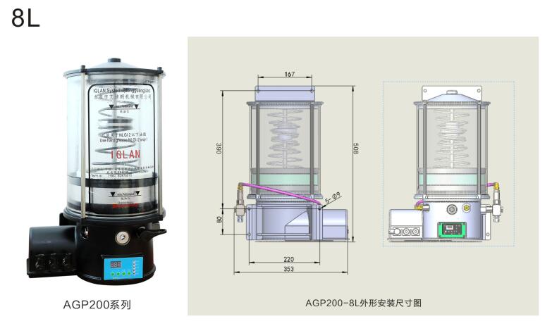 性能特点: AGP200电动润滑泵利用直流电机驱动力,进行柱塞泵进行往复吸油和排油。电源采用DC24V电源,油桶提供6L、8L、10LPc透明塑料,可分压盘式和搅...