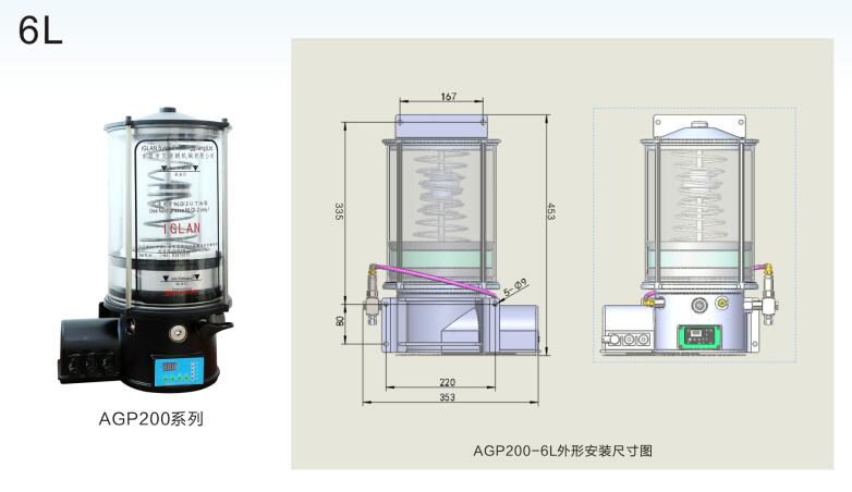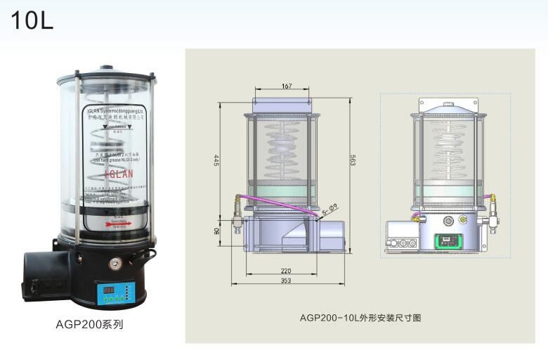 性能特点: AGP200电动润滑泵利用直流电机驱动力,进行柱塞泵进行往复吸油和排油。电源采用DC24V电源,油桶提供6L、8L、10LPc透明塑料,可分压盘式和...