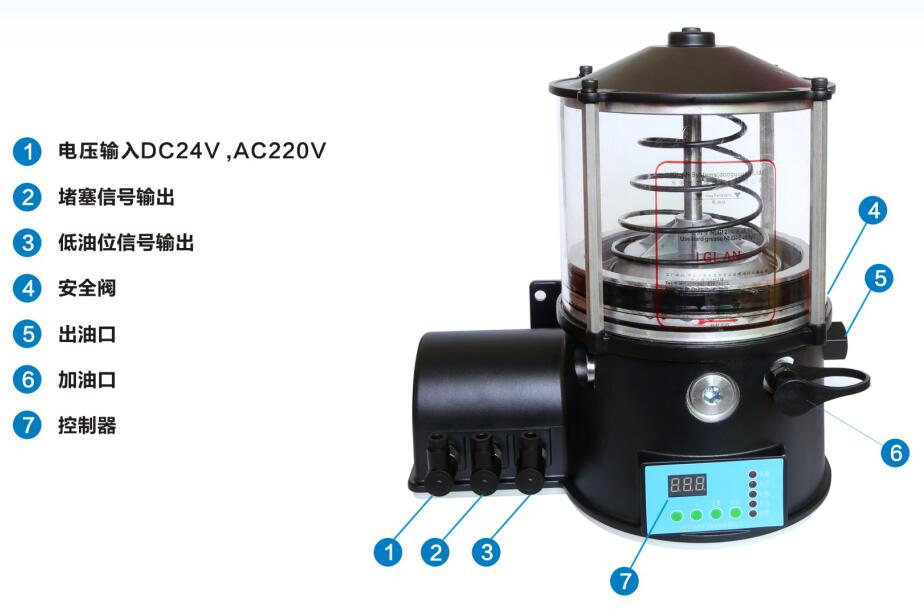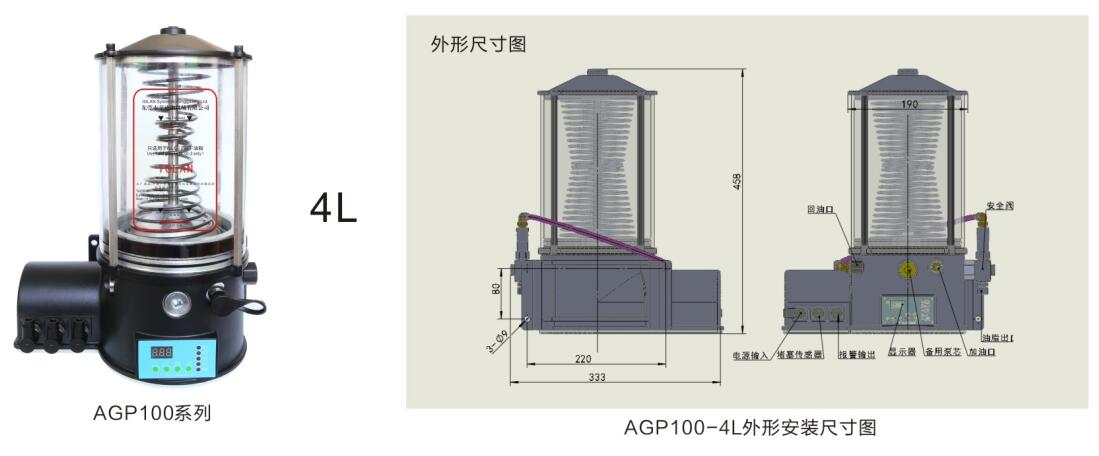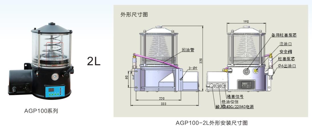 AGP100电动润滑泵利用直流电机驱动力,进行柱塞泵进行往复吸油和排油电源采用DC24电源,油桶提供2L、4L Pc透明塑料,可分压盘式和搅拌式两种,压盘式上通过锥度弹簧进行加压,可倒置与旋转中工作。AGP100电动润滑泵控制器内置压力开关、计数、低油位传感器报警信号输出。有安装2个排量为2.5cc/min柱塞泵。外部安装安全阀,压力可达30MPa。