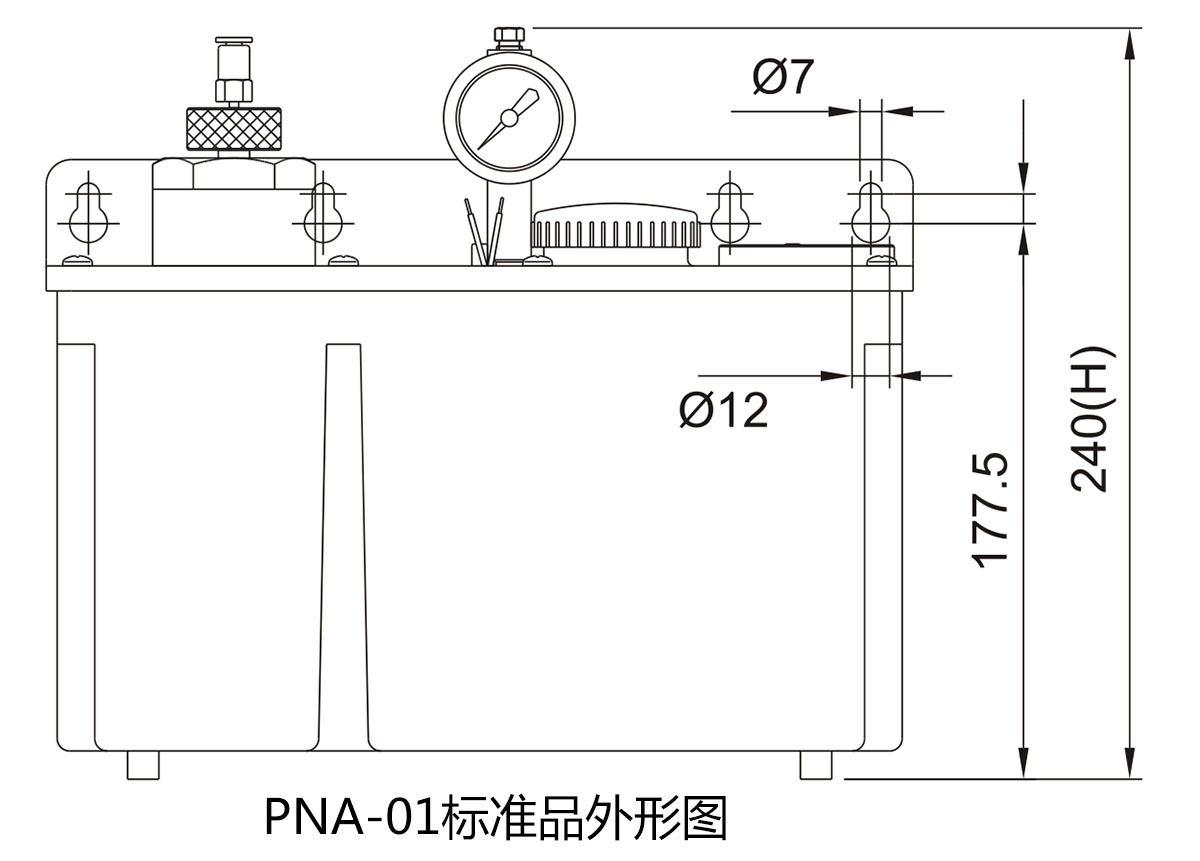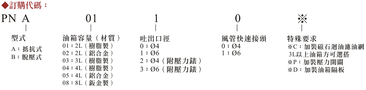 性能特点: 1.气动式注油机由电磁阀控制之空压驱动,压力大小由轮入之空压控制,为间歇式给油,免轮入电源、兔电子箱·精构简单不易损坏。 2.PNA型气...