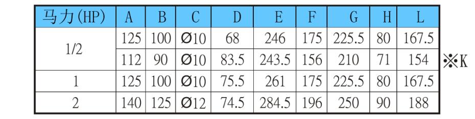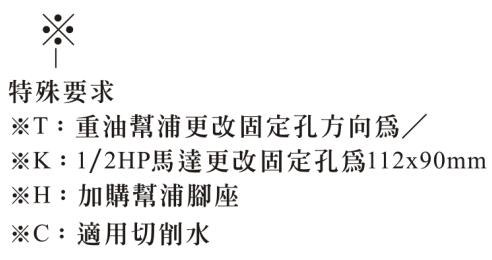 5、重油泵浦若选用1/2HP马达,标准品固定孔125×100mm无注记,若欲更改固定孔112×90mm,请在订购代码处加注※K。